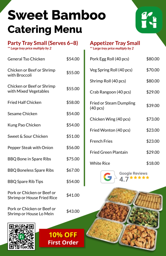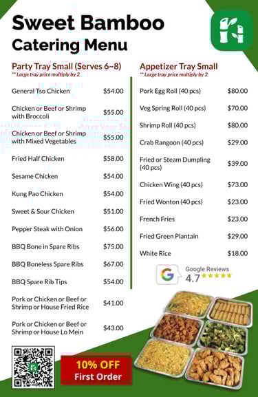 Welcome to Sweet Bamboo Catering! We're bringing the delicious taste of our Chinese restaurant to your special events. Whether it's a work meeting or a family celebration, we're here to make your food experience unforgettable.